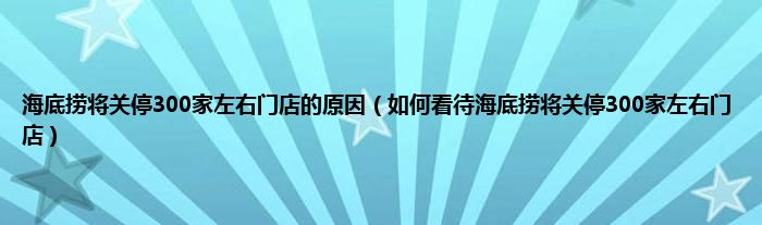 大家好,海底捞将关停300家左右门店的原因,如何看待海底捞将关停300家左右门店很多人还不知道,现在让我们一起来看看吧!