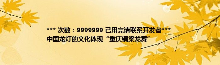 本文*** 次数:9999999 已用完请联系开发者*** 中国龙灯的文化体现“重庆铜梁龙舞”到此分享完毕,希望对大家有所帮助。