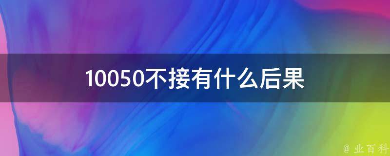 最佳答案10050不接没有什么后果,像这种客服电话,如果真的有事,会连续拨打好几次。中国铁通10050客服热线作为对外服务的重要窗口之一,秉承为用户负责的服务理念,在用户与铁通之间架起一座相互沟通的桥梁。用户拨打10050便可轻松办理业务、详细咨询疑难问题、快速得到故障受理。