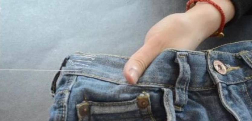 最后,收尾针需要将针线沿着裤子中间线由外向内,再由内向外一戳即可。这是只需要再用力拉一拉缝线,刚才缝纫的针线就会被隐藏起来,裤腰也会变小。