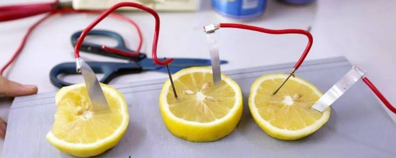 水果电池是由水果(酸性)、两金属片和导线简易制作而成。两金属片要是活动性强弱相差较大的金属片,一般采用是铜片和锌片,由于锌片的活动性较强,易失去电子,因此作为负极,相对而言,铜片的活动性较弱,不易失去电子,因此作为正极。铜片和锌片通过电解质(即水果中富含的果酸)和导线构成闭合回路,铜片置换出果酸中的氢离子产生正电荷,锌片失去电子产生负电荷,因此闭合回路中产生电流,若在该电路中再连接一个LED,灯泡便可以发光。
