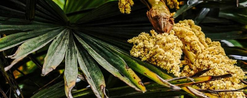 棕榈花可以吃。棕榈花是一种很好的菜果,营养丰富,富含维生素,可生吃也可熟吃。棕榈花在花苞期的时候,外形看起来像一条鱼。外面裹着层层的类似笋衣样的外壳,里面是密密麻麻小花苞,就像鱼籽一样,所以又称“棕鱼”。