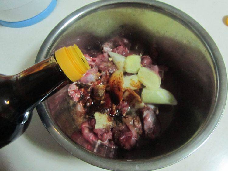 4、放入姜片、大葱段、料酒、酱油等调味料。