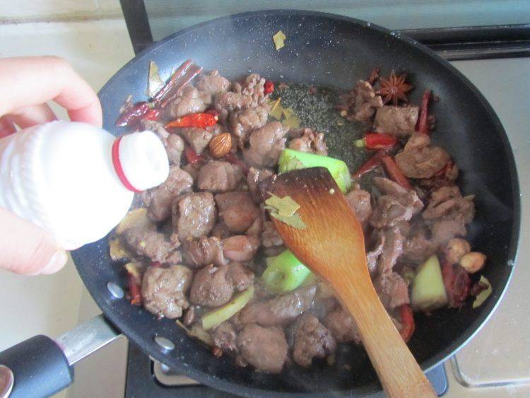 12、小火慢慢煸炒,再加入少量的白酒和酱油,继续煸炒。