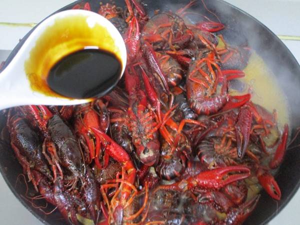 7、加入生抽和老抽翻炒均匀后再倒入热水,水量能浸没龙虾,加盖大火烧开后转中火。