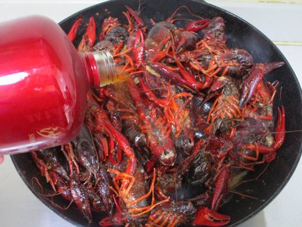 6、把小龙虾倒入翻炒至变色倒入黄酒,也可以用料酒或者啤酒代替。