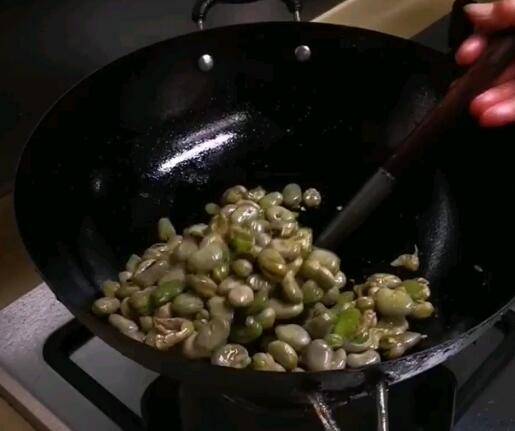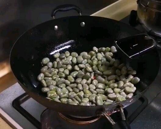 4、倒入煮好的胡豆,炒至外皮微干。