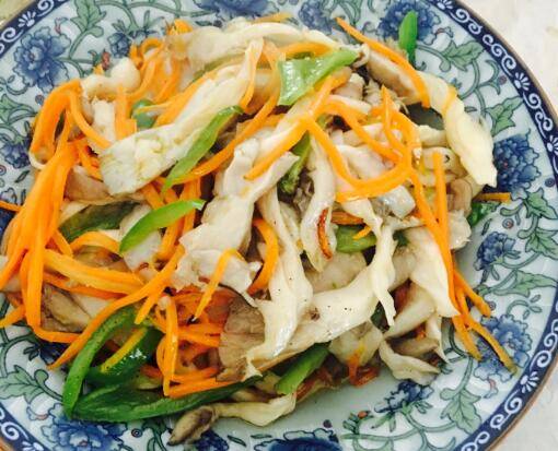 1、平菇手撕成条,开水烫一下,青椒、胡萝卜切丝备用。