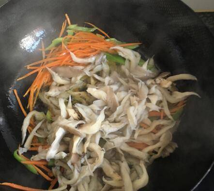 2、倒油,先炒青椒和胡萝卜丝,然后放平菇,翻炒,倒鸡精、盐炒匀。
