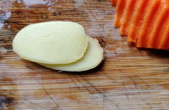 5、干净无水锅,开大火,倒入玉米油烧热,下姜片爆香。