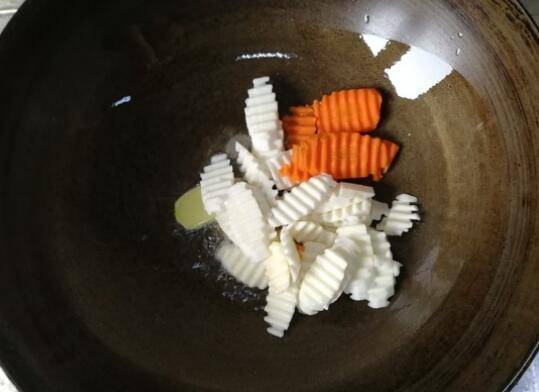 6、倒入山药片,胡萝卜片,一起翻炒。