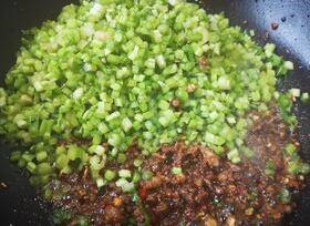 放入生抽,辣椒碎一起翻炒,再放芹菜碎。