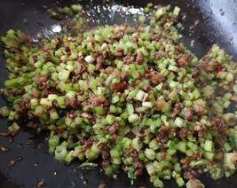 芹菜碎和牛肉混合均匀,炒的过程芹菜会出水分,这个没有关系,再放一点蚝油,撒点孜然即可收汁出锅。