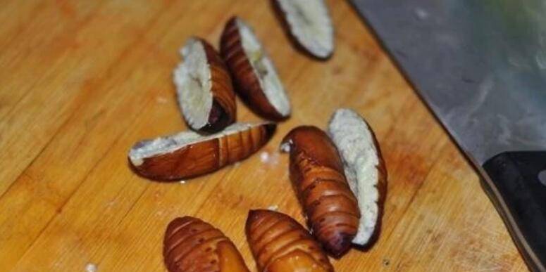 4、把蚕蛹切开两半,去掉黑心。