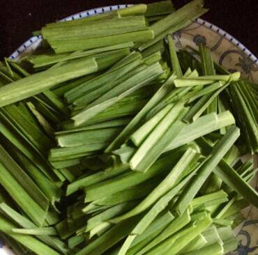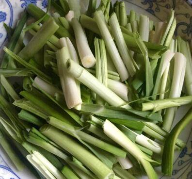 大蒜切段,蒜白一切两瓣或者用菜刀拍一下,同时生姜切片。