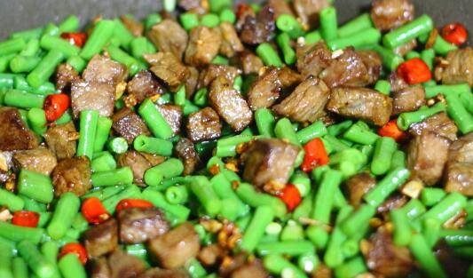 豇豆10根、牛肉100g、蒜5个、生姜1小块、小米辣5个、食用油适量、盐少许、生抽1勺。