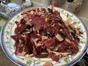 1、牛干巴切片,牛油和牛肉分开切。
