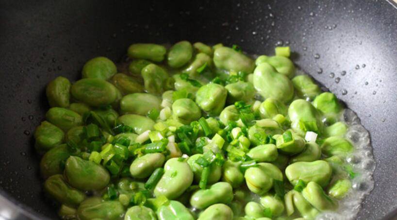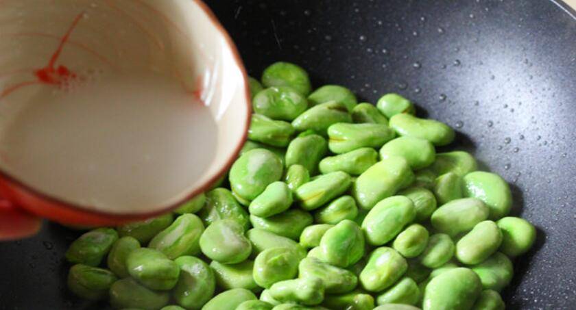 2、炒锅烧热后放油,下蚕豆快速翻炒。