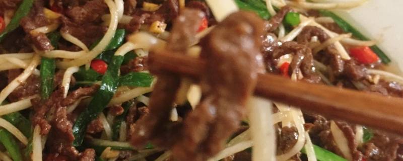 豆芽两头摘掉,牛肉逆向纹路切丝。