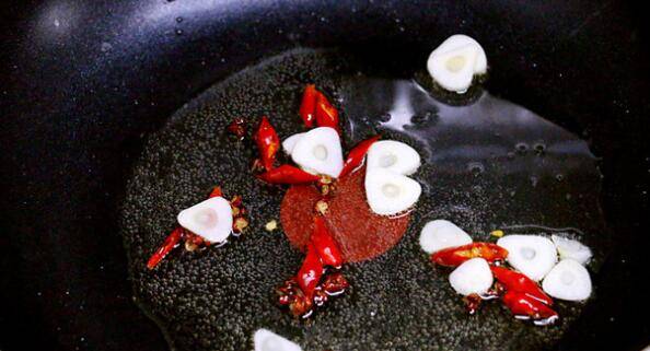 7、热锅热油,下入花椒粒、蒜片和辣椒段炒出香辣味。