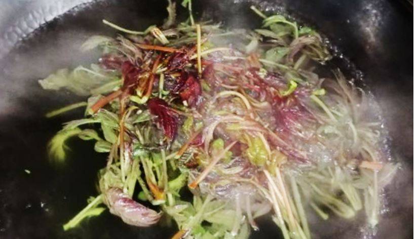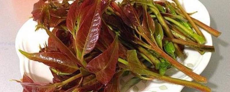 2、烧一锅开水,把香椿芽投入开水,氽烫到香椿全部变成绿色。
