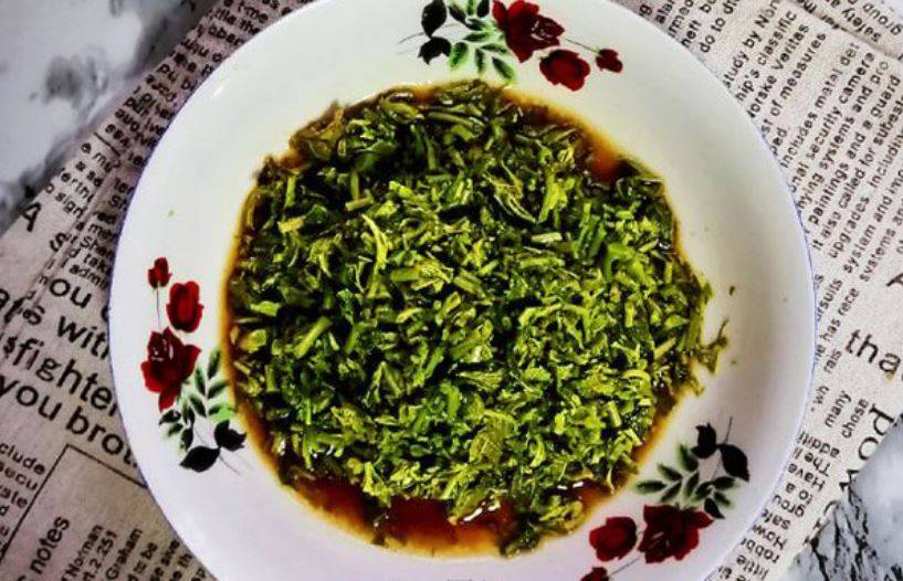 5、最后把味汁淋入香椿芽中拌匀即可。