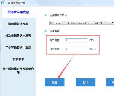 进入打印模板参数设置界面,选择发票的类型,输入向下、向右调整参数。参数自己先预估,之后,点击预览。