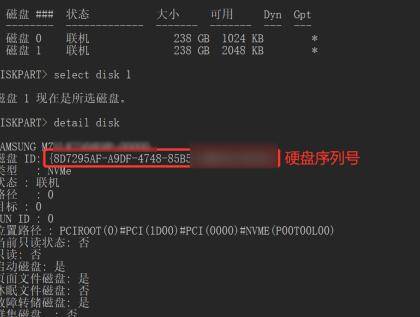 3、依次输入list disk - select disk 0 - detail disk ,输入完成之后,显示硬盘的详细参数,有个磁盘ID的即是硬盘序列号。