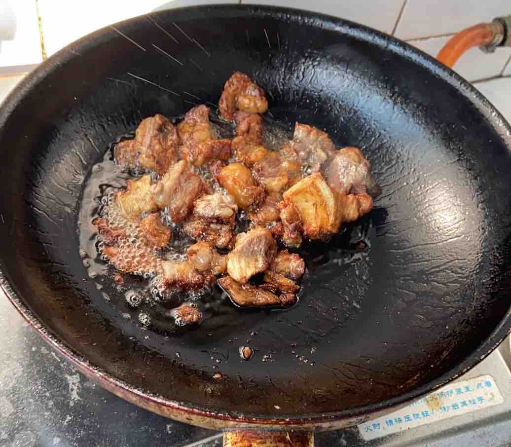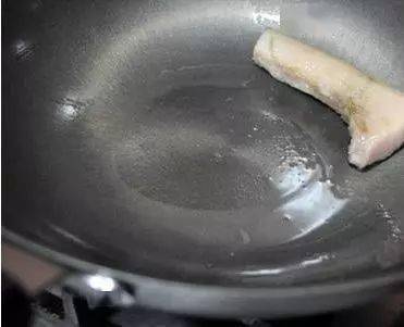 3、把锅烤干后,加热放一块肥肉来回涂抹锅底,至锅底有少量油。