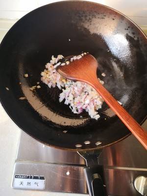 4、然后放入洋葱,小幅度不断翻炒,炒到洋葱变软。