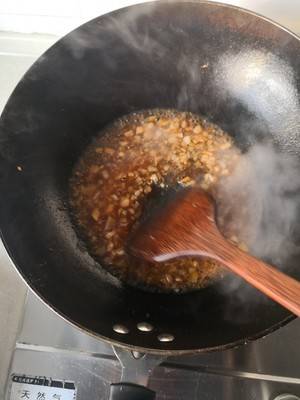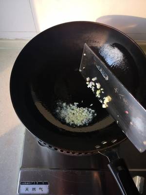 3、空锅大火烧热以后,放入少量的油,等待两三秒,关到最小火,放入大蒜末,让大蒜末慢慢炸到变软,略微变色。