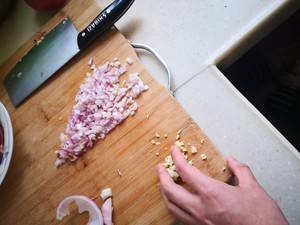2、把洋葱、大蒜切碎,不要混在一起。