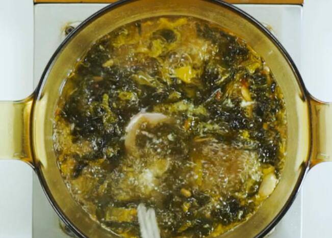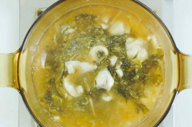 3、清水煮沸,放入炒好的酸菜、鸡粉3克、老抽5克、胡椒粉1克,再放入腌好的鱼片。