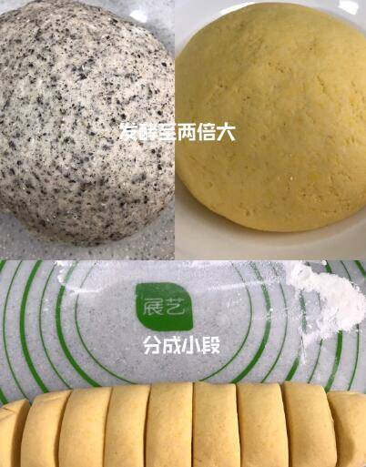盖上保鲜膜放置在温暖处发酵,发酵至原先面团的两倍大。发酵好的面团取出,在面板上撒一些干面粉,揉搓排气后搓成长条,切成小段。