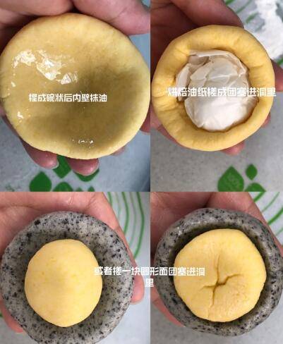 将每一块面团捏成碗状,内壁刷一层薄薄的油,可以用烘焙油纸团成团塞进碗口里,或者搓一块圆形的面团塞进碗口里,这样蒸出来的碗口才不会塌。