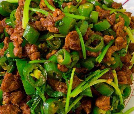 锅里热油放入葱姜煸炒牛肉,加老抽、生抽、盐调味,牛肉炒熟加线椒,出锅加香菜即可。