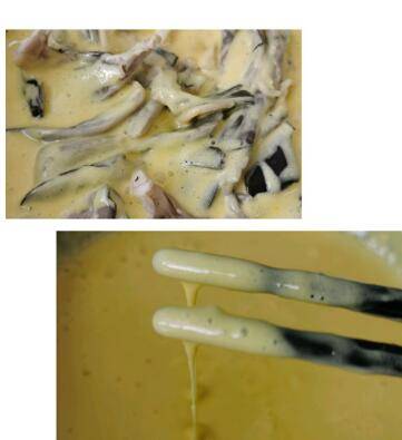 搅拌均匀、可以挂成一条线,把蘑菇放进去挂糊。