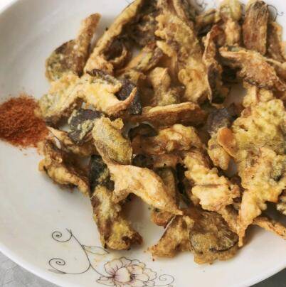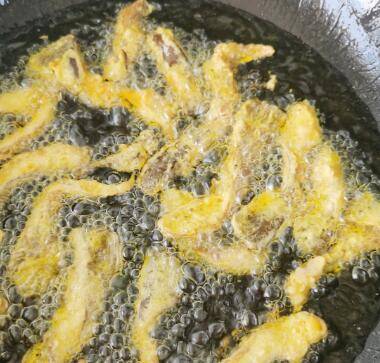 油温7成、把挂上糊的蘑菇一根一根的放入锅中进行炸至金黄。