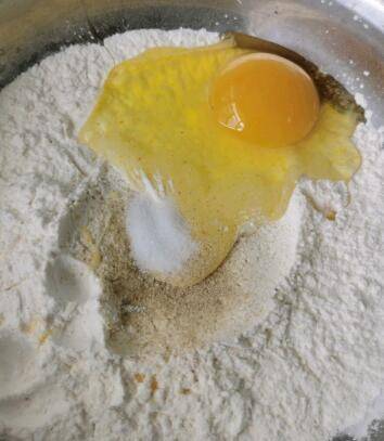 面粉:淀粉=2:1,放1颗鸡蛋、胡椒粉、少许盐搅拌均匀。