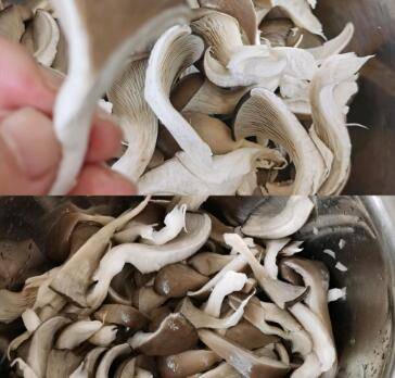 蘑菇择成小朵,洗干净。锅中水烧开后,蘑菇焯水2分钟。将蘑菇用手挤干,平铺开稍微晾干一下。