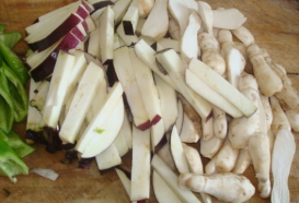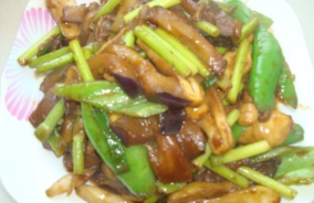 待葱变色后,放入切好的鸡腿菇、茄子和青椒翻炒,三分钟后放入老抽和盐继续翻炒;