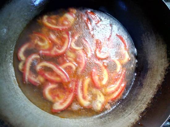 3、锅烧热,倒入适量油,倒入番茄先煸炒一下。