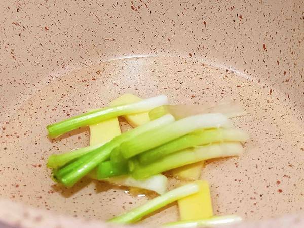 4、热锅放油,放入葱姜炒香。