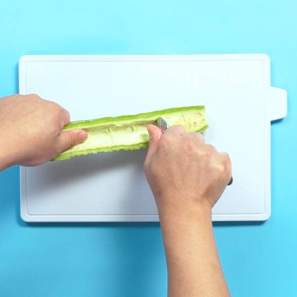 1、苦瓜去瓤切条,胡萝卜去皮切条。