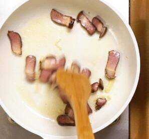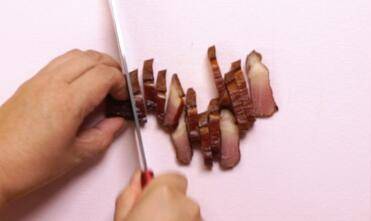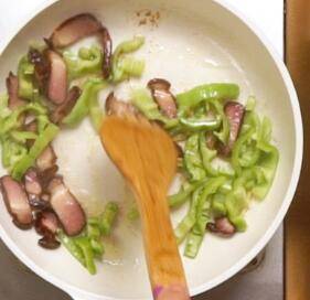 2、锅中倒油,加入姜丝,倒入腊肉,翻炒均匀。