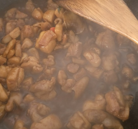 放入鸡肉煸炒5分钟,放盐、糖、蚝油和老抽调味;