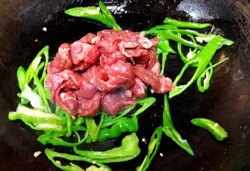 4、油加肉放螺丝椒炒香断生,大火下牛肉,快速翻炒。
