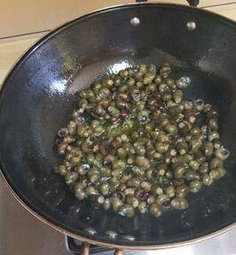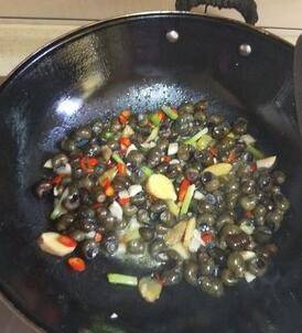 2、热锅热油,大火放入螺丝翻炒片刻加入料酒。