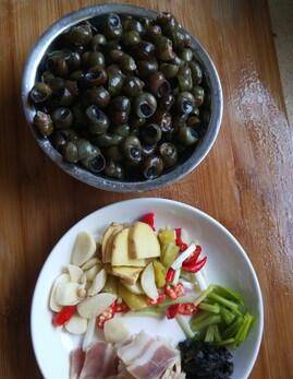 用料:螺丝500克、大蒜5瓣、生姜一大块、小米辣、料酒1勺、生抽1勺、白糖1勺、葱、腌肉1小块、紫苏2片。