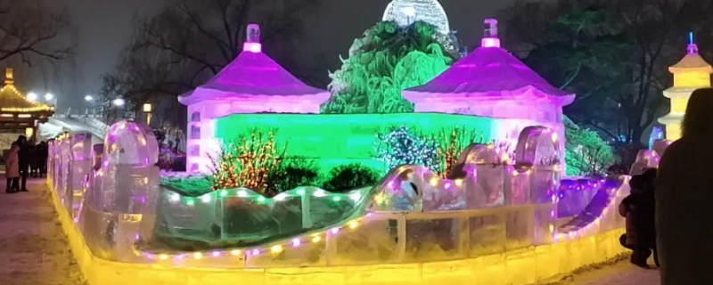 南湖公园冰灯在南湖公园二号门。冰雪灯光展主要分为激情冬奥和溢彩华章两个区域。激情冬奥区位于公园二号门直路,包括中国传统大红灯笼为元素,与虎年生肖相融合的彩灯,和20座形态各异的萌虎穿插在32组吉祥如意灯廊中,喜迎2022北京冬奥会。溢彩华章区包括百年华章、醉美南湖、扬帆起航等冰雕作品。